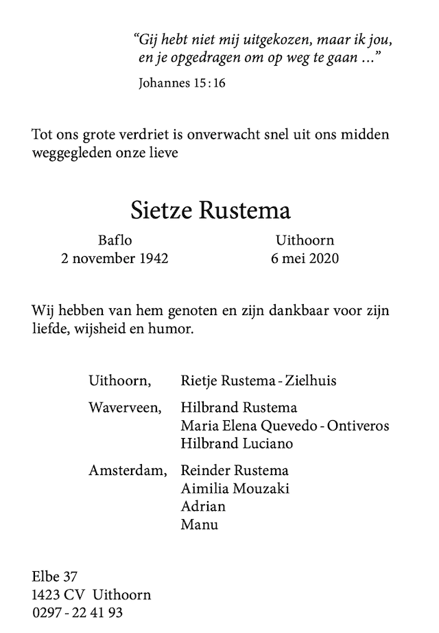 De familie vindt het fijn als u hun een herinnering aan Sietze toestuurt via